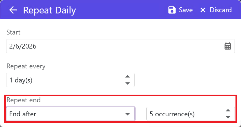 To end the daily recurrence after a specific number of occurrences, follow these steps: