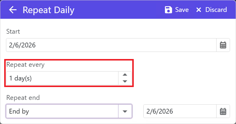 - In the Repeat dropdown, select the Daily option to schedule a recurring appointment. The Repeat Daily configuration screen opens.