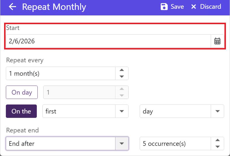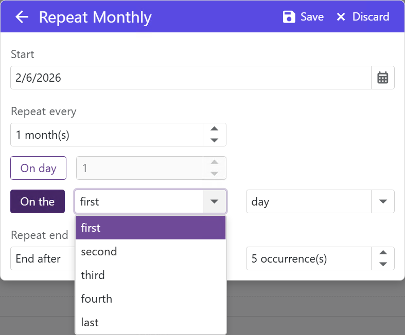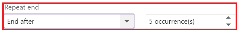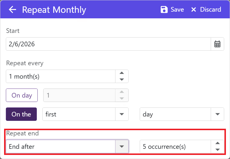 To end the monthly recurrence after a specific number of occurrences, follow these steps: