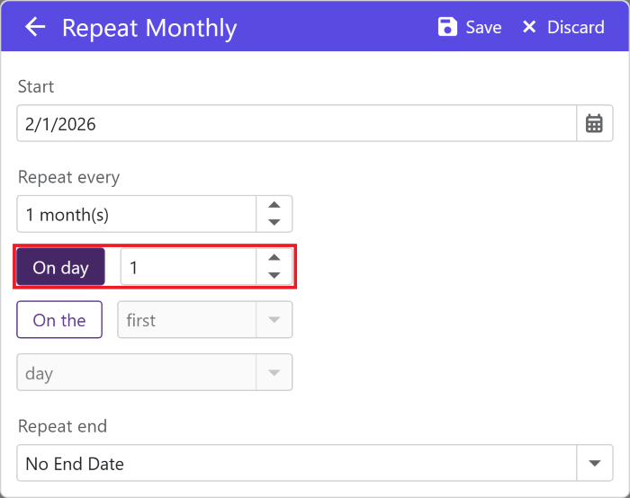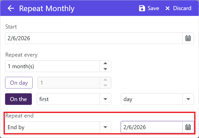 - Set the end of the monthly recurrence in any of the following ways and click the Save
