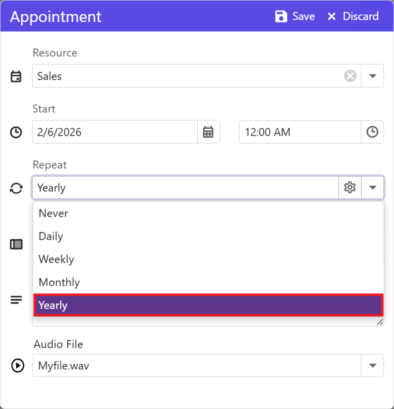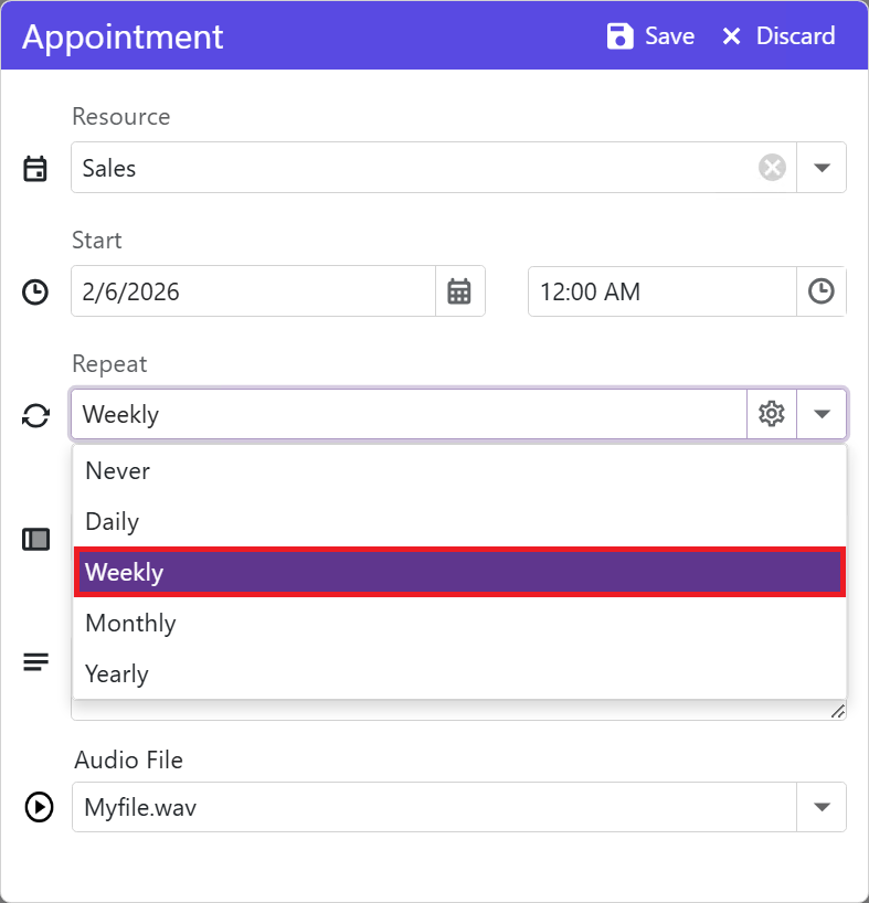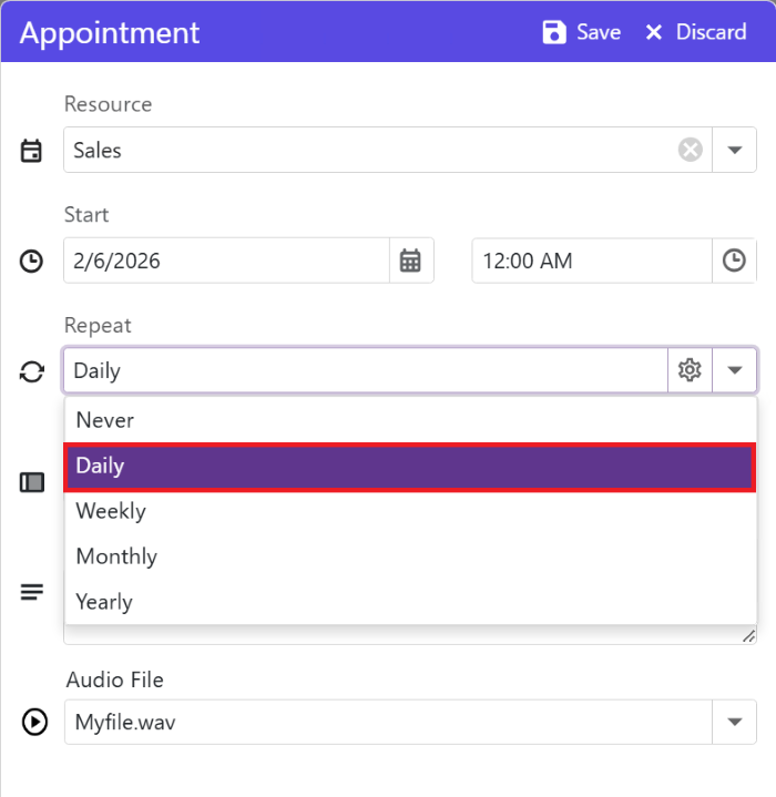 - Daily, Weekly, Monthly, or Yearly for recurring appointments.