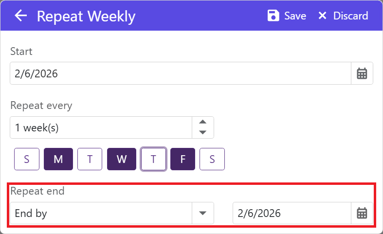 - Set the end of the weekly recurrence in any of the following ways and click the Save