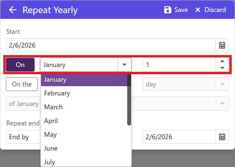 - Set the end of the yearly recurrence in any of the following ways and click the Save