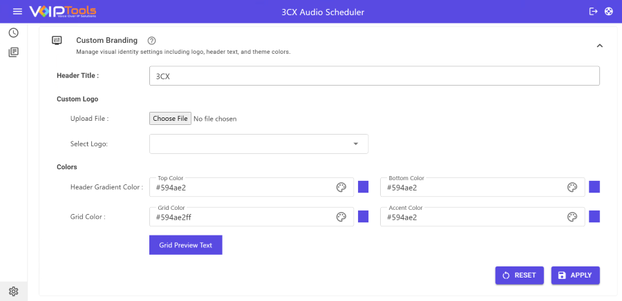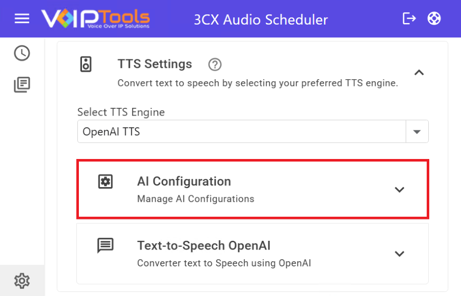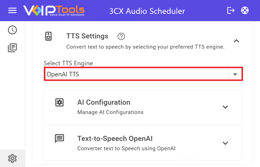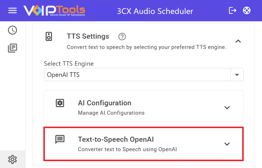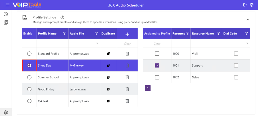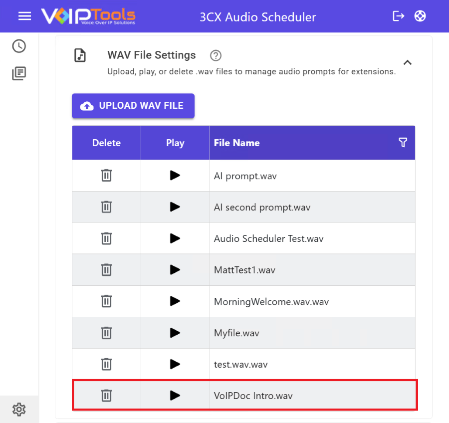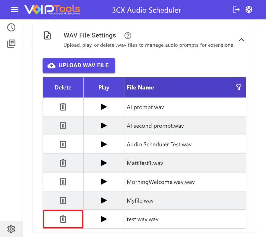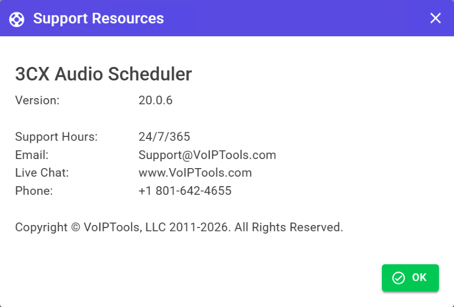 This tab provides you with essential support resources for the 3CX Audio Scheduler. It includes the version number (20.0.6), contact email, live chat link, and phone number. This information ensures you can access technical support and assistance whenever needed. For more details on VoIPTools Support click here.