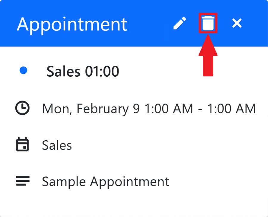 - Click the scheduled appointment to open the View Appointment popup and click the Delete Appointment button.