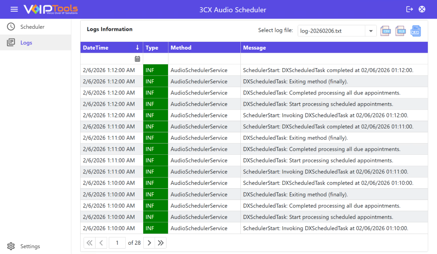 The Logs menu provides access to system activity records generated by the 3CX Audio Scheduler service. Use this section to review scheduled task execution, processing status, and service-level events. Logs are displayed with date and time, event type, method, and message details to help monitor system behavior and troubleshoot issues. You can also select and export log files for further analysis or recordkeeping.