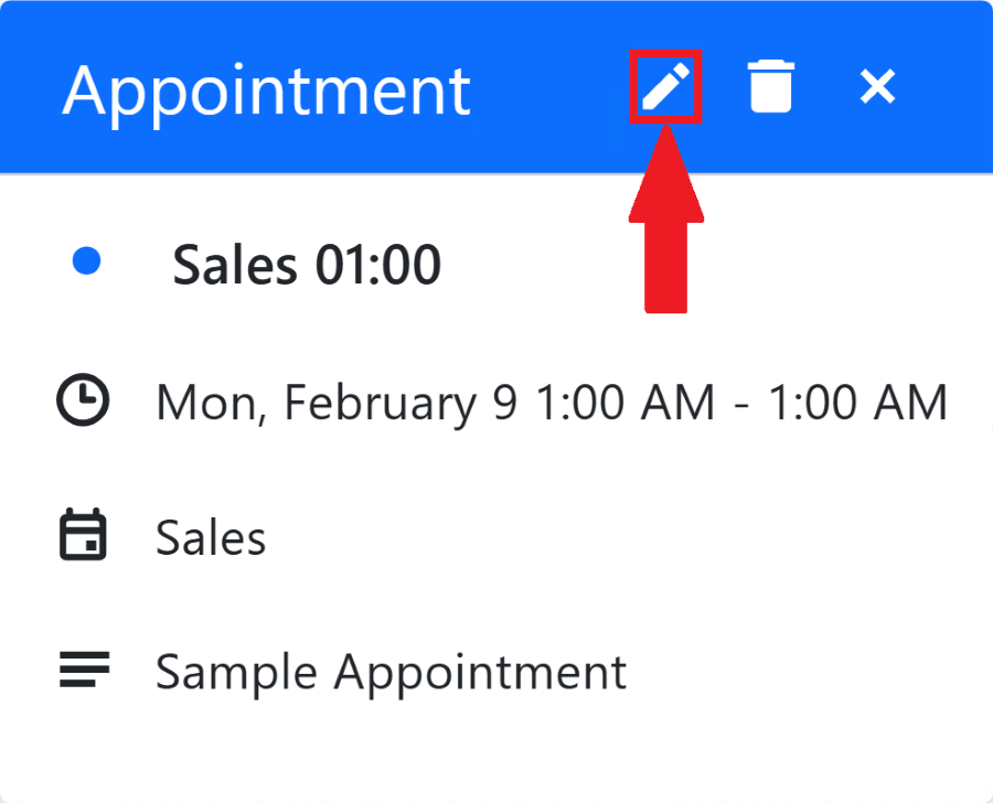 - Click the scheduled appointment to open the View Appointment popup and click the Edit Appointment button.