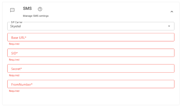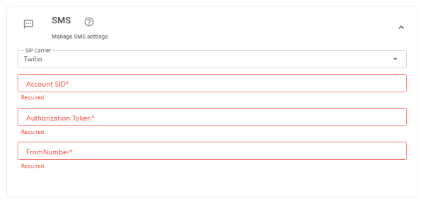 | SMS | Select Email, Skyetel, or Twilio to send SMS messages for scheduled appointments, ensuring the required credentials for your chosen carrier are saved in the app settings for proper delivery. |