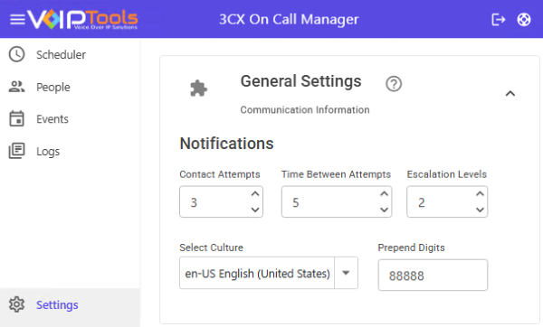 The General Settings tab puts you in complete control of call escalation logic, ensuring no alert is missed. You can customize reliability by setting the exact number of Contact Attempts and the necessary waiting time between them before escalating a call to the next person. For efficiency and consistency, this tab also lets you apply a consistent Culture for date/time formatting and uses Prepend Digits to guarantee successful call routing within your 3CX system.