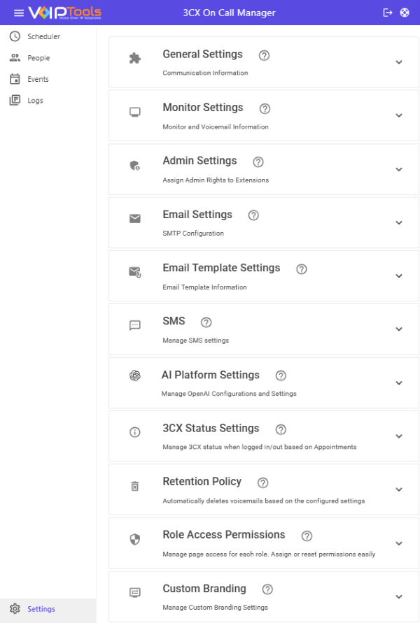 The Settings Menu provides the centralized control panel for 3CX On Call Manager. From this comprehensive dashboard, you can manage core functions like general configuration, user rights, and monitoring, while also setting up communication channels (email/SMS), defining Retention Policies, and integrating with AI platforms. These controls ensure system security, optimized performance, and custom branding for your interface.