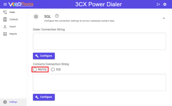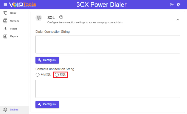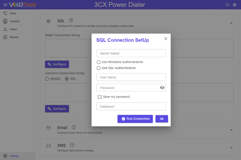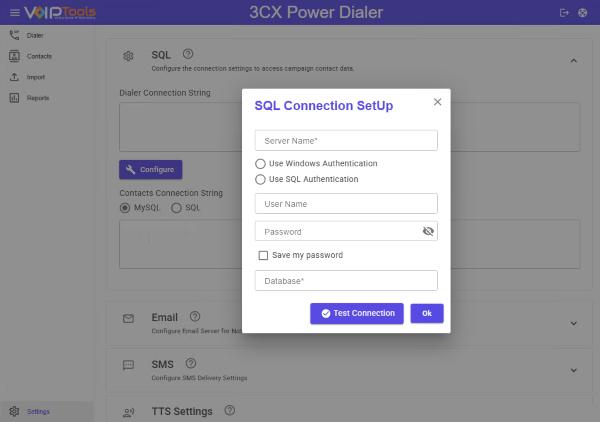 When configuring the 3CX Power Dialer, select an existing Microsoft SQL Server instance in your environment. The database server can be a remote SQL Server, or a local instance running on the VoIPTools server.