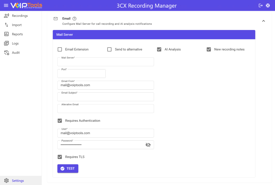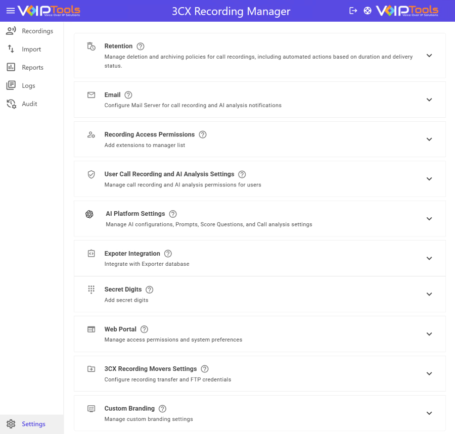 DOWNLOAD SOFTWARE | You can order 3CX Recording Manager online at https://www.voiptools.com. Your order confirmation email will include your license key and a link to download the software. |