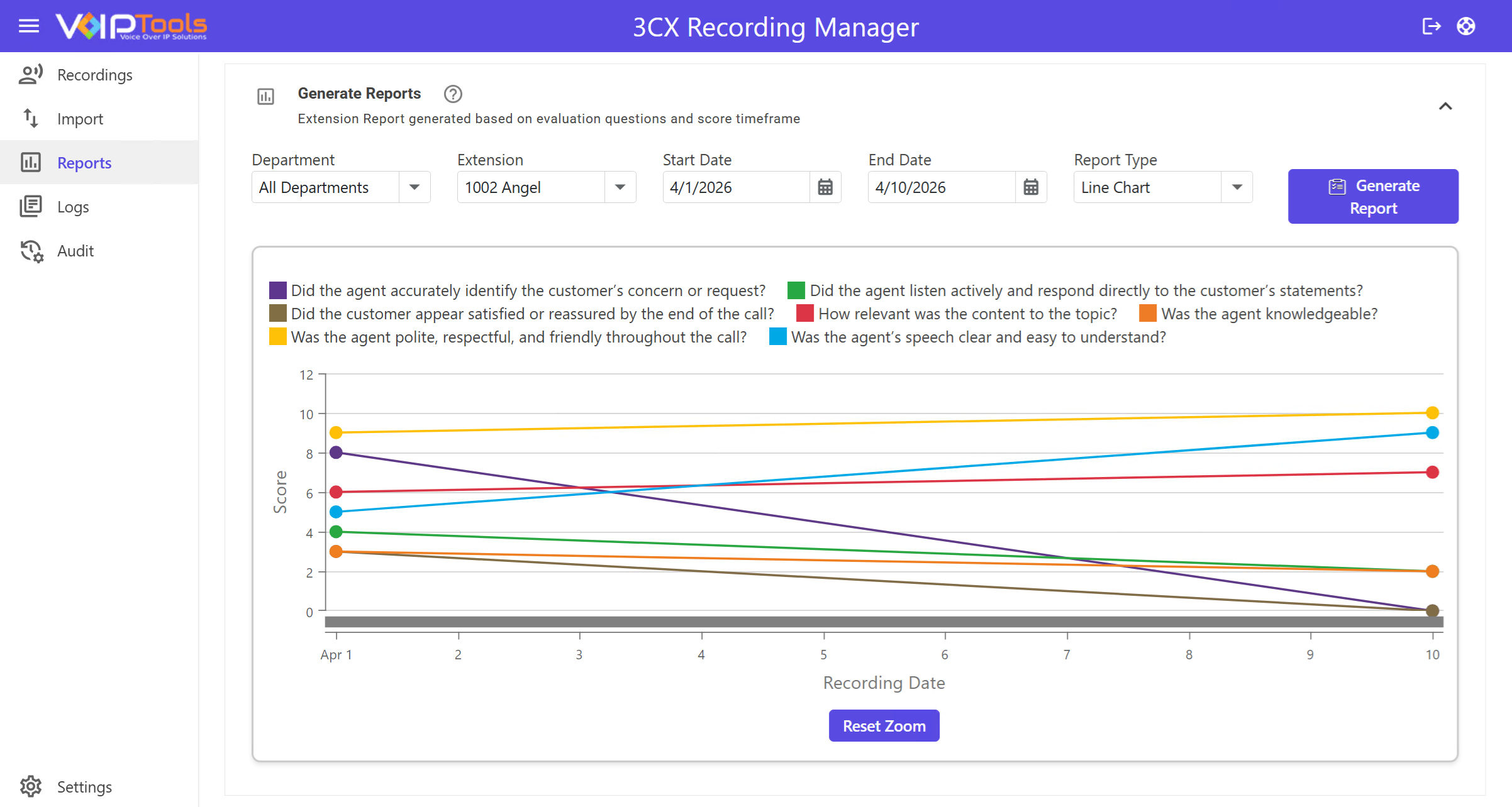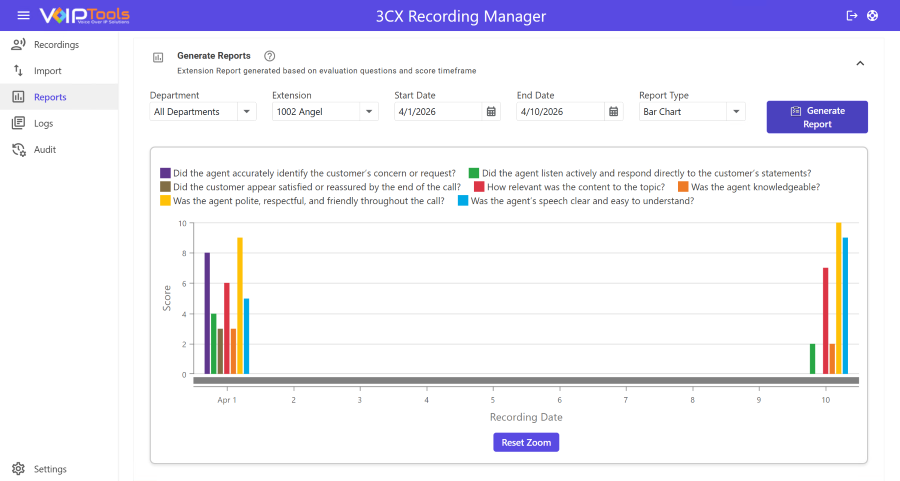 The Reports Menu allows users to generate visual reports based on evaluation scores over a selected timeframe. These reports help identify trends, assess individual or departmental performance, and support data-driven decision-making. With customizable filters and visual reporting options, users can gain actionable insights to improve service quality and team efficiency.