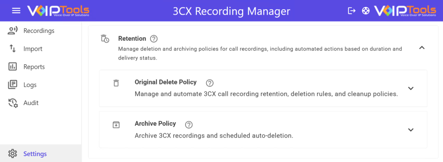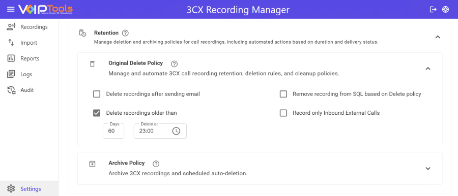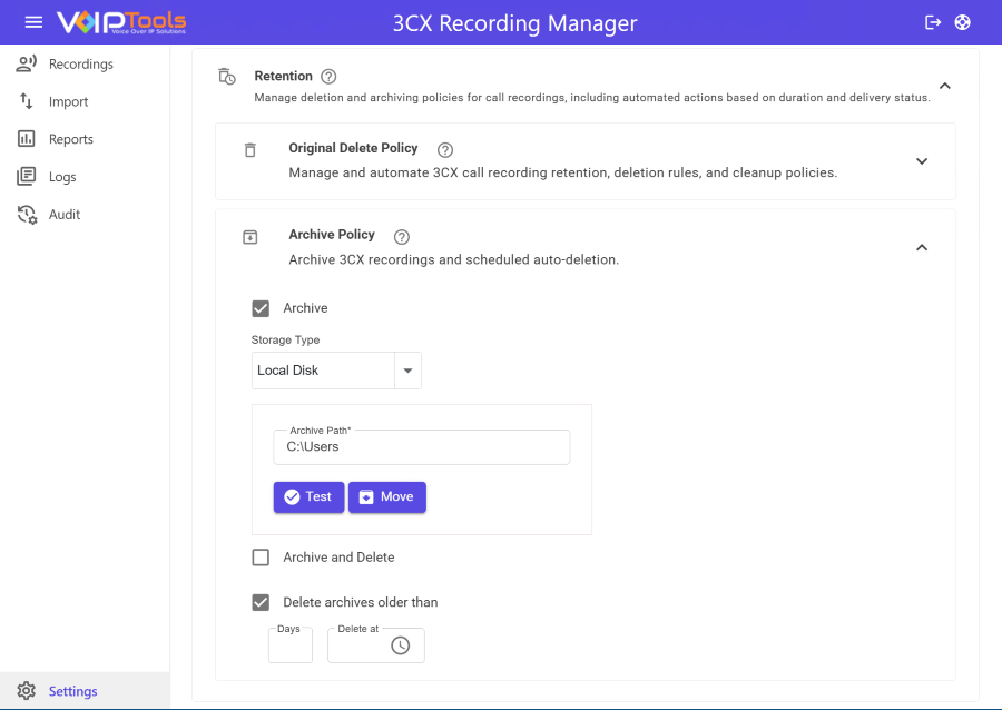 3CX Recording Manager helps you manage disk space efficiently by archiving phone recordings as MP3 files, which use far less storage than WAV files. It offers automated compression, secure backups to another location, and a retention policy that automatically deletes recordings older than a set date that keeps storage optimized and organized.